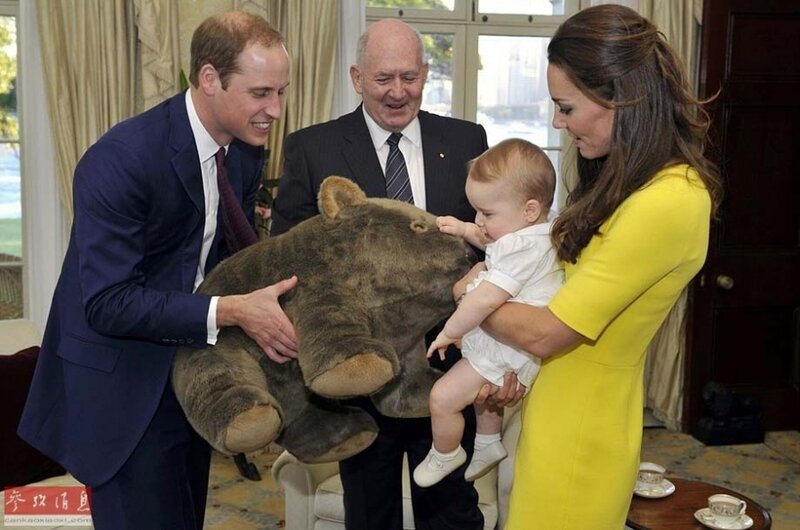 4月16日,在澳大利亚总督官邸,英国威廉王子拿着澳大利亚总督送给乔治小王子的礼物,陪乔治玩耍。威廉王子和凯特王妃目前正带着乔治小王子在新西兰和澳大利亚进行为期19天的官方访问。