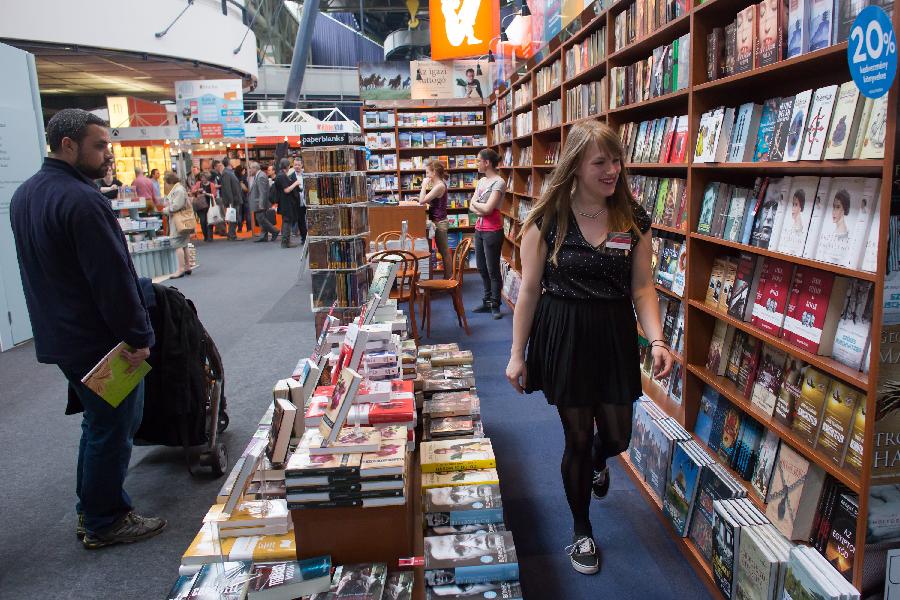 4月24日,参展商在第21届布达佩斯国际图书节上展示图书。 当日,第21届布达佩斯国际图书节在匈牙利布达佩斯千年公园开幕。 新华社发(弗尔季·奥蒂洛摄)