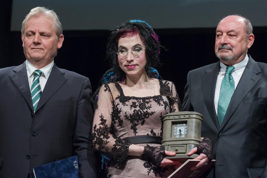 4月24日,在第21届布达佩斯国际图书节开幕式上,芬兰小说家索菲·奥克萨宁(中)获颁“布达佩斯大奖”。当日,第21届布达佩斯国际图书节在匈牙利布达佩斯千年公园开幕。 新华社发(弗尔季·奥蒂洛摄)