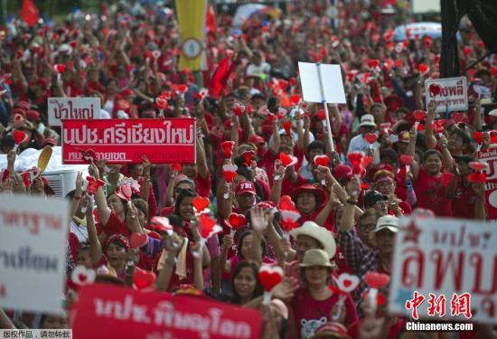 资料图:当地时间2014年5月11日,泰国曼谷,泰国“红衫军”高举英拉和他信的头像举行大规模集会,声援政府并抗议宪法法院等独立机构的“不公”。