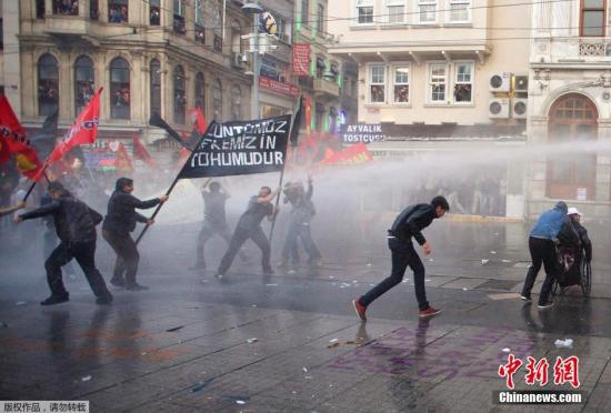 5月14日,土耳其伊斯坦布尔,土耳其民众就矿难举行示威游行,遭警方喷水炮驱散。据外媒15日报道,土耳其能源部长伊尔迪兹称,土耳其煤矿爆炸事件遇难人数已经上升至274人,使这次事故成为土耳其史上最严重的矿难。