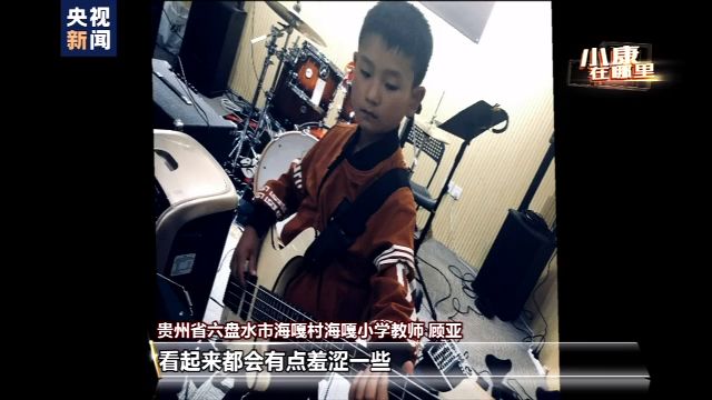 贵州省六盘水市海嘎村海嘎小学教师 顾亚:他是第一个组乐队的,贝斯手。也是海嘎小学的第一贝斯手,你看那会儿在排练的时候,他的动作还有表情都会显得比较羞涩一些,而这张照片先看一下,你看动作眼神笑容,你看都是很自信的。