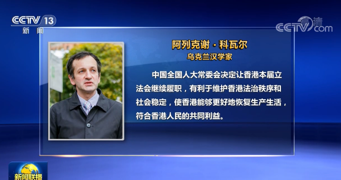 乌克兰汉学家阿列克谢·科瓦尔认为,中国全国人大常委会决定让香港本届立法会继续履职,有利于维护香港法治秩序和社会稳定,使香港能够更好地恢复生产生活,符合香港人民的共同利益。