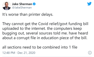 《政客Politico》记者杰克·谢尔曼 (Jake Sherman) 透露,电脑故障导致法案文本的分发受阻。当天,工作人员试图将法案上传到网上时,电脑一直出错,原因可能是文本中有一个损坏的文件。