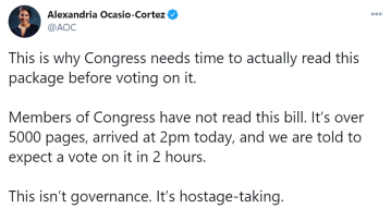 迈克·李的遭遇还算好的,民主党众议员科尔特斯(Alexandria Ocasio-Cortez)只提前两小时拿到了5千多页的法案文本,根本就不可能提出意见。她愤怒地发推文抗议:“这不是在施政,这是劫持人质。”