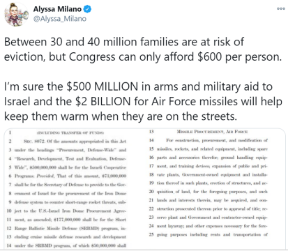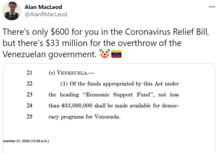 好奇的网友们掀起了一场“自学”法案的运动,然后纷纷发现,原来这份打着纾困旗号的法案,其中还真“夹带”了不少内容。例如,给以色列提供5亿美元军事援助,给太空军拨款20亿美元,为支持委内瑞拉的“民主项目”提供3300万美元……看到这些五花八门的开支,再对比一下这份疫情“纾困”法案中给普通民众提供的600美元,很多美国网友的愤怒溢于言表。