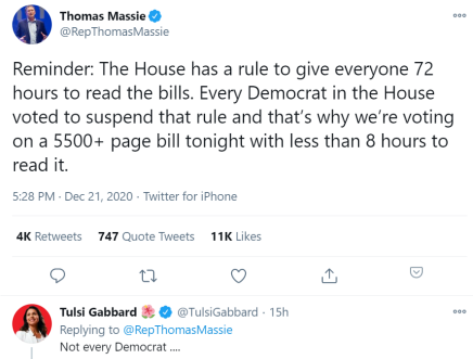 这时,共和党国会议员托马斯·马西 (Thomas Massie)出来“友情提醒”:“众议院有一个规则,给每个人至少72小时阅读法案。但是众议院的所有民主党人都投票搁置了这一规则,这就是为什么我们今晚要对一个5500多页的法案投票,而阅读它的时间还不到8小时。”
