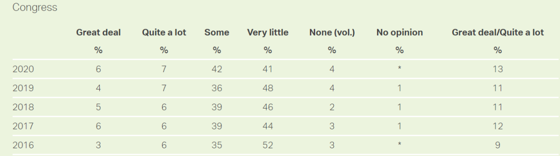 △盖洛普民调显示:民众对国会少有信任或不信任的比例常年维持在50%左右