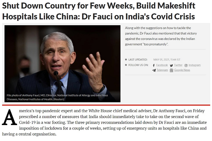 福奇指出,在中国疫情暴发时,中国政府在短时间内采取了及时有效的措施,阻断了新冠病毒的传播链条。因此他建议印度政府应该尽快实施短期全面封锁,以阻隔印度当前的疫情传播。