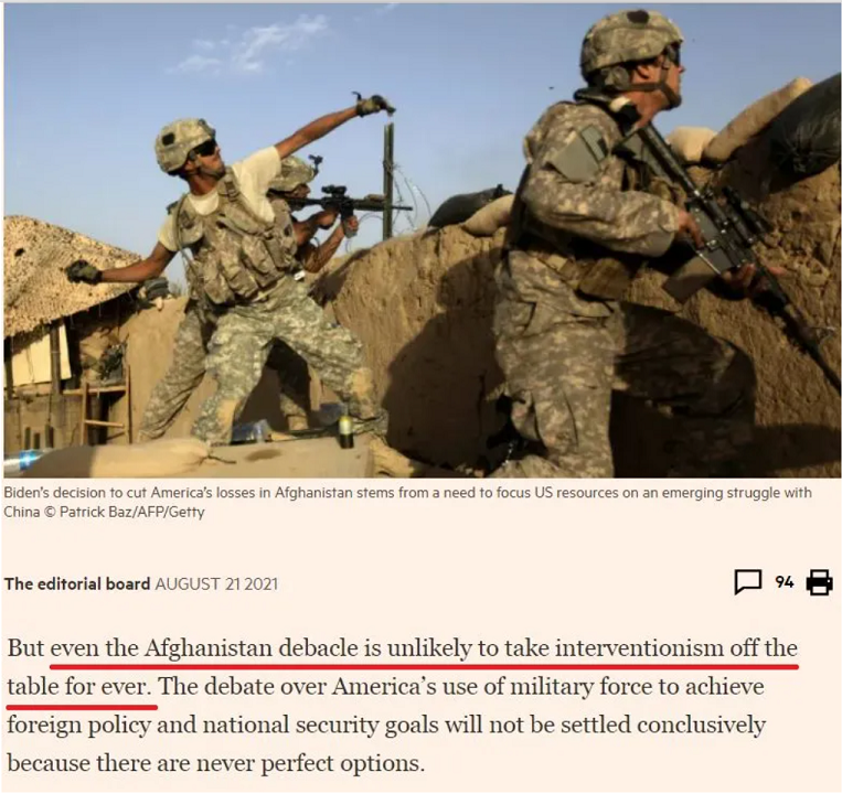 英国《金融时报》的社论也指出,在经历了“喀布尔时刻”之后,人们很容易认为未来的美国或许会更加内敛。但是,即使是阿富汗战争的惨败也不太可能让美国的干涉主义永远消失。
