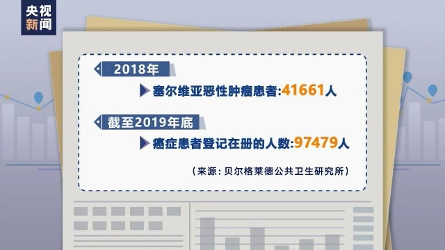 根据贝尔格莱德公共卫生研究所的统计,2018年,塞尔维亚共有恶性肿瘤患者41661人,截至 2019 年底,癌症患者登记在册的人数升至97479名。据塞尔维亚急救中心的研究表明,1999年以后本国出生的儿童,1到5岁多发外胚层肿瘤,5至9岁多发恶性血液病,9至18岁则脑瘤发病率急速上升。