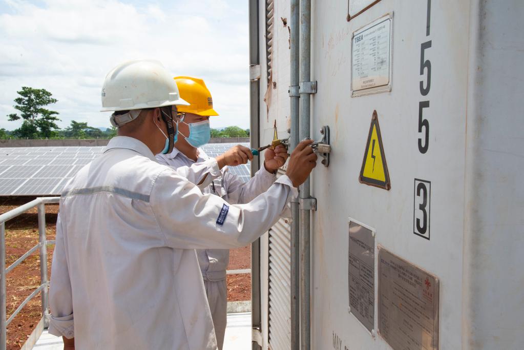 2022年6月2日,在中非共和国首都班吉附近的宾博市,工程师在萨卡伊光伏电站检修设备。(新华社记者罗毓摄)
