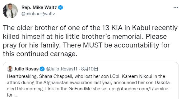 2021年8月26日,喀布尔机场发生自杀式袭击,炸死13名美军,年仅20岁的卡里姆·尼库伊就是其中之一。2022年8月9日,在一场对他的周年纪念活动上,尼库伊28岁的哥哥达科塔当场自杀。两度痛失爱子的母亲只能尝试通过募捐来渡过危机。佛罗里达众议员迈克·沃尔茨在社交媒体上呼吁,“必须有人对这起持续的屠杀负责。”