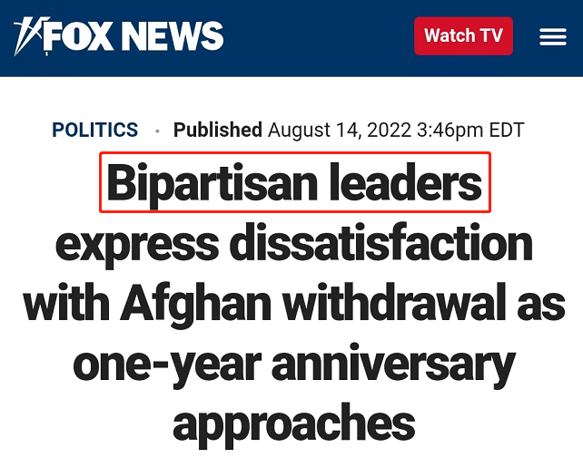 撤离一周年之际,根据福克斯新闻报道,持批评立场的民主共和两党议员甚至捐弃成见,联合发声表达对美国仓皇撤退的不满。