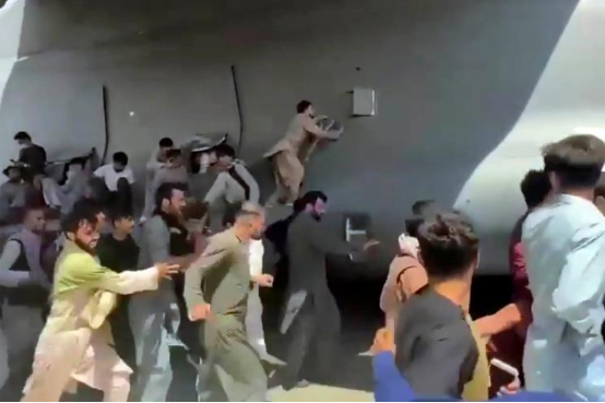 △一年前的喀布尔机场,美国军机挂着试图登机的阿富汗人强行起飞