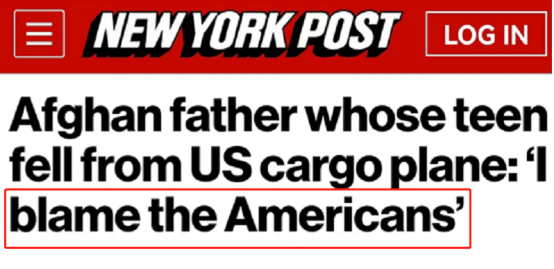 阿富汗平民穆罕默德·雷扎伊在美军撤离时失去了两个儿子。他告诉西方记者:“我归罪于美国人。”一年前,雷扎伊的两个儿子,17岁的扎比和19岁的扎基试图扒上飞机离开,当这位父亲跑了4.2公里追到机场时,他只看到了扎比摔碎了的尸体。老父亲又跑遍了喀布尔的医院和监狱,到处都没有扎基的消息。“我的一个儿子从喀布尔机场的飞机上掉下来摔死,而我直到现在还不知道另一个儿子是死是活。”