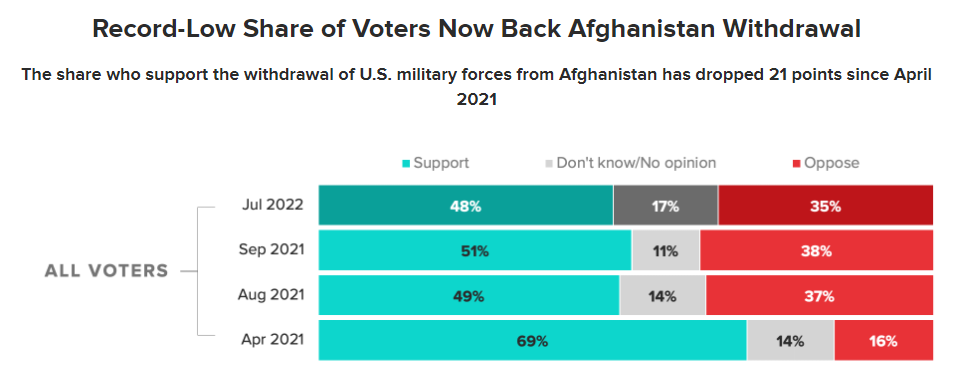 民意数据的变化更加直观。美国晨间咨询公司(Morning Consult)提供的民调数据显示,美国混乱和不负责任的撤离闹剧使得大量原本支持撤军的美国民众改变想法,撤离行动的支持率在一年后再次创下新低。这么多美国民众改变态度,不是因为支持战争,而是因为对政府的处理能力大失所望。
