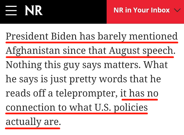 时隔一年,美媒《国民评论》把拜登的讲话“挖坟示众”,批评拜登说完话就把阿富汗忘了,他的承诺“和美国的实际政策毫无关联”。