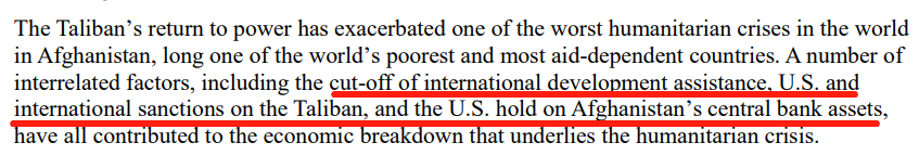美国无法忽视阿富汗的悲惨现状,于是“贼喊捉贼”的美式笑话层出不穷。美国会研究处6月的一份报告堪称“典中典”:上一句还宣称阿富汗塔利班的上台加剧了人道主义危机,下一句列举的导致危机原因,居然条条都是美国所为——国际援助的中断、美国及其盟友的制裁和美国扣押阿央行资产,难道这就是拜登对阿富汗人民承诺的人道主义援助、国际影响力和外交手段?