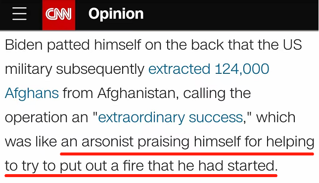 美国有线电视新闻网(CNN)8月12日也讽刺到,拜登“称撤离行动是巨大成功,就像纵火犯自夸尝试扑灭自己引发的火灾。”