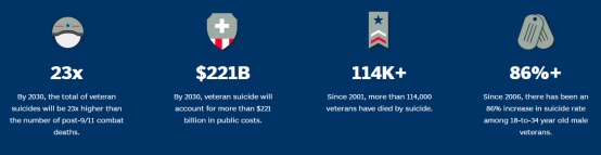 根据美国公益组织 “阻止退伍军人自杀”提供的最新数据,从2001年以来已有超过11.4万美国退伍军人自杀;到2030年,自杀的退伍美军人数将比“9.11”以来美军阵亡人数高出23倍,给美国社会造成的经济损失也将超过两万亿美元。平均每天有18名退伍军人在美国本土自杀。