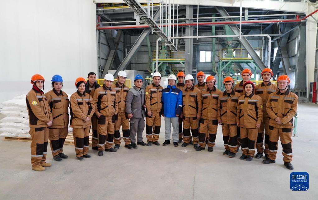 2019年12月28日,在乌兹别克斯坦纳沃伊市,乌兹别克斯坦聚氯乙烯生产综合体项目竣工投产后中方与乌方人员合影。新华社发(扎法尔·哈利洛夫摄)
