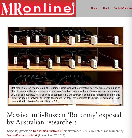图为美国《每月评论》网站报道《澳大利亚研究人员曝光大规模反俄“机器人网军”》截屏。