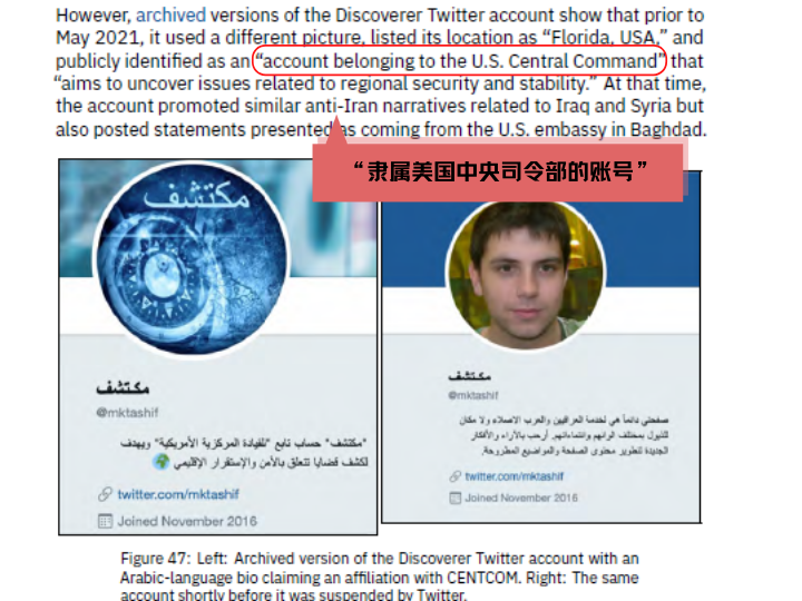 报告披露,社交媒体部分虚假账号关联美军。图为报告截图。