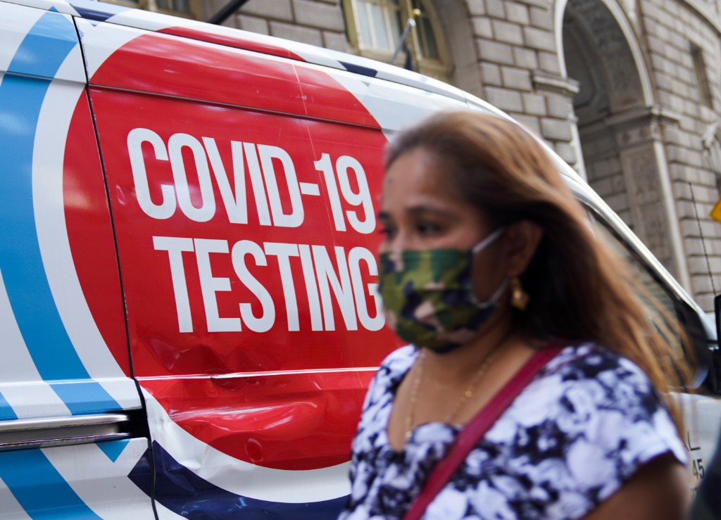 2021年9月6日,一名女子从美国纽约的移动新冠检测点旁经过。(新华社记者王迎摄)