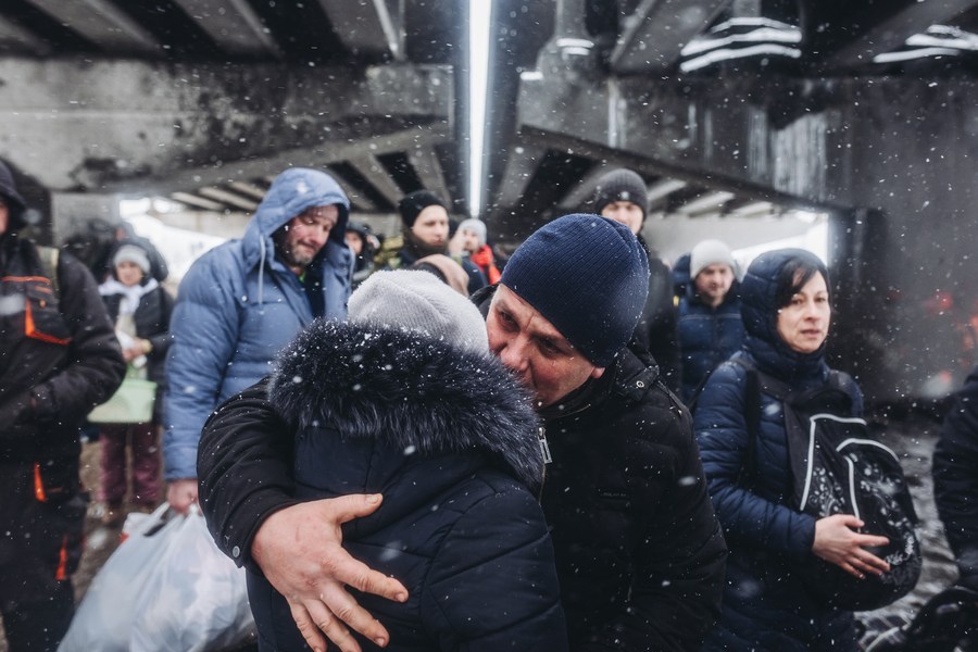2022年3月8日,一对情侣在乌克兰伊尔平告别。(新华社发,迭戈·埃雷拉摄)