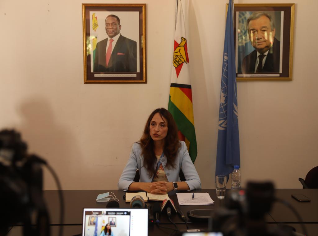 2021年10月28日,联合国单边强制措施对人权负面影响问题特别报告员阿莱娜·杜汉在津巴布韦首都哈拉雷的记者会上发言。新华社发(肖恩·朱萨摄)