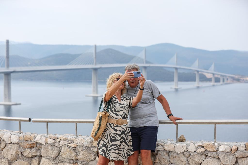 2022年7月27日,民众在克罗地亚科马尔纳与新通车的佩列沙茨大桥合影。新华社发(Pixsell图片社,伊戈尔·克拉利摄)