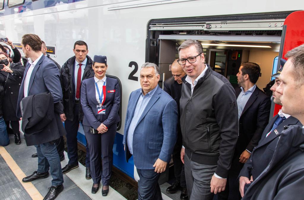 2022年3月19日,匈塞铁路塞尔维亚境内贝诺段开通运营。塞尔维亚总统武契奇(中右)和匈牙利总理欧尔班(中左)乘坐列车抵达诺维萨德火车站。新华社发(王韡摄)