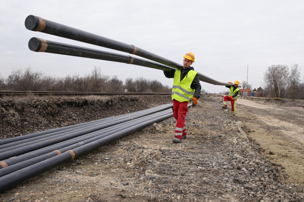 2月22日,工作人员在匈牙利索包德萨拉什的匈塞铁路匈牙利段工地搬运电缆保护管。新华社记者郑焕松摄