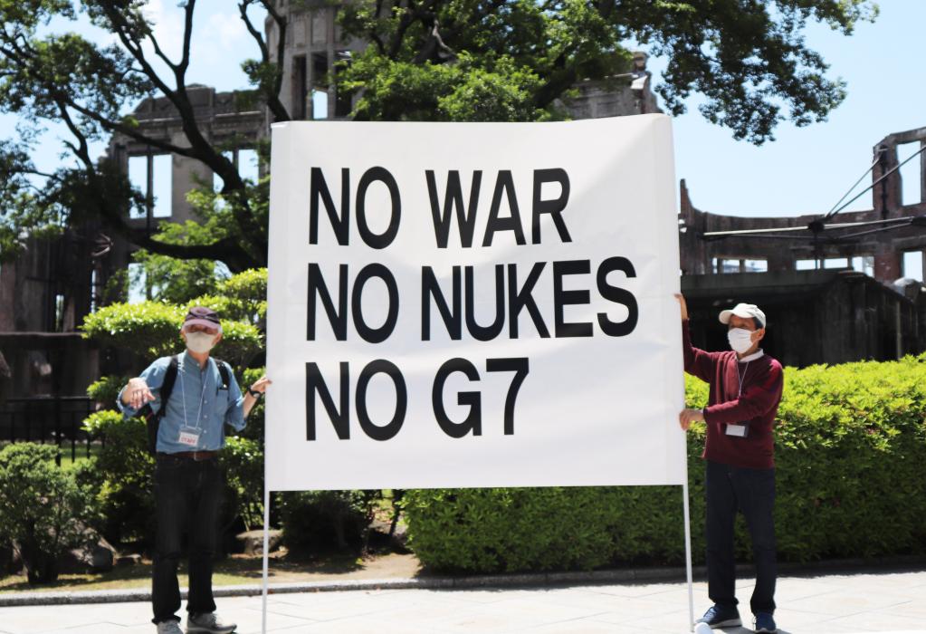 5月14日,在日本广岛和平纪念公园原子弹轰炸遗址前,日本民众举着“不要战争、不要核武器、不要G7”等标语,强烈抗议七国集团(G7)峰会将在广岛召开。新华社记者杨光摄