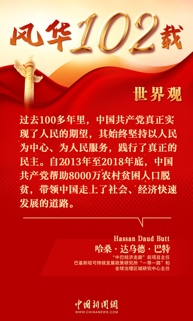 中新网7月8日电(陈彩霞)日前,投资领域专家,“中巴经济走廊”前项目主任、巴基斯坦可持续发展政策研究所“一带一路”和全球治理区域研究中心主任哈桑·达乌德·巴特(Hassan Daud Butt)在接受中新网专访时表示,过去100多年里,中国共产党真正实现了人民的期望,其始终坚持以人民为中心、为人民服务,带领中国走上了社会、经济快速发展的道路。