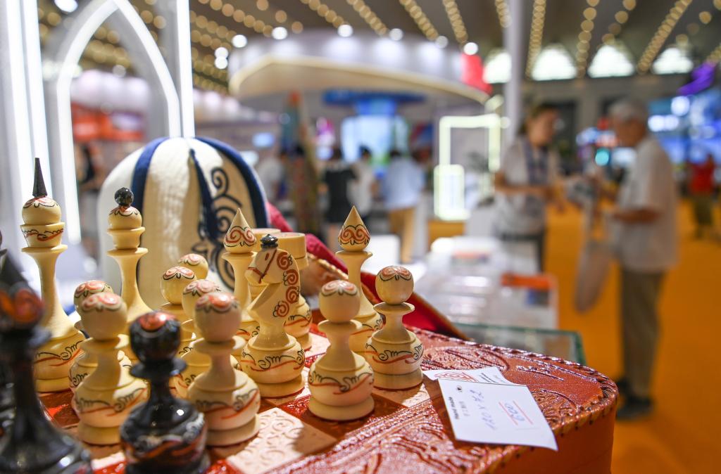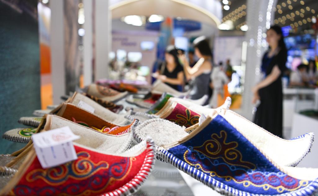 8月19日,参观者在交流合作馆吉尔吉斯斯坦展区了解特色商品。新华社记者 邹竞一 摄