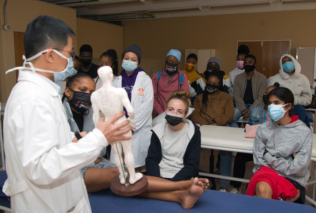 针灸课老师胡紫景在南非约翰内斯堡大学给同学们讲解人体穴位分布。南非约翰内斯堡大学2020年2月正式开设针灸课,十分受学生们欢迎。