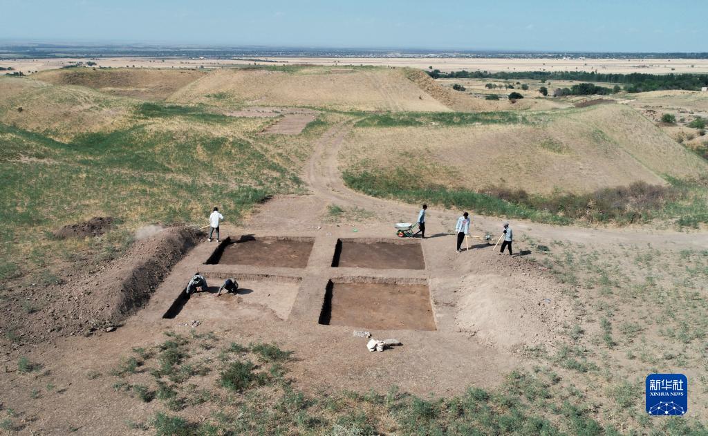 2023年8月9日,考古人员在中哈联合考古项目拉哈特遗址探方上工作(无人机照片)。新华社发(奥斯帕诺夫 摄)