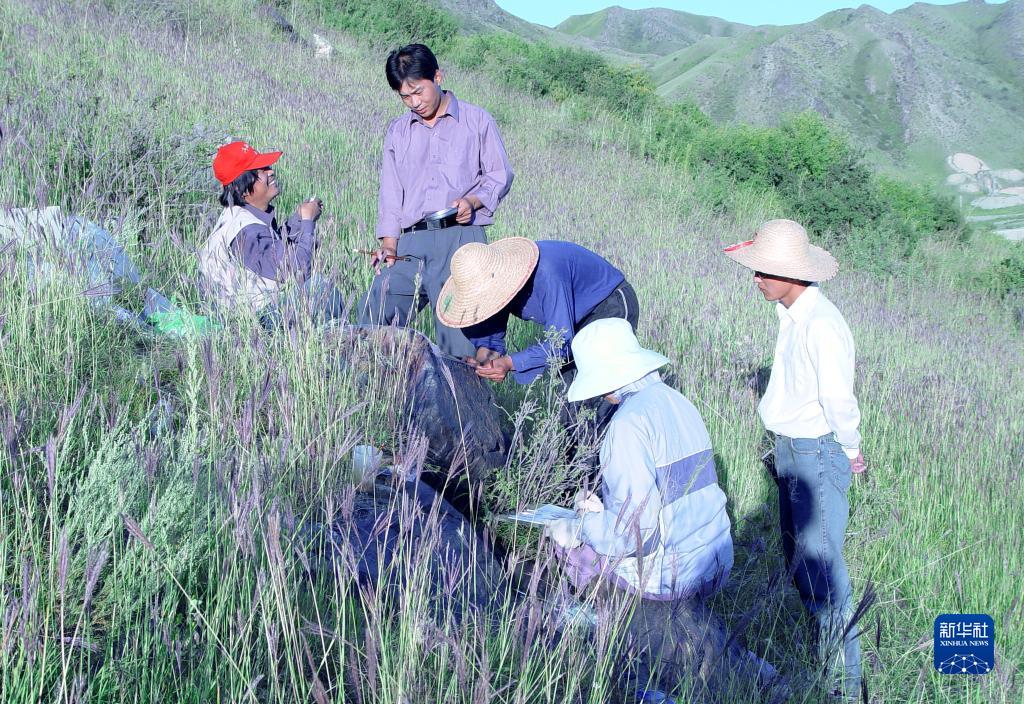 2003年8月,王建新(左一)带领学生在新疆尼勒克县调查、临摹岩画。新华社发(丝绸之路考古合作研究中心供图)