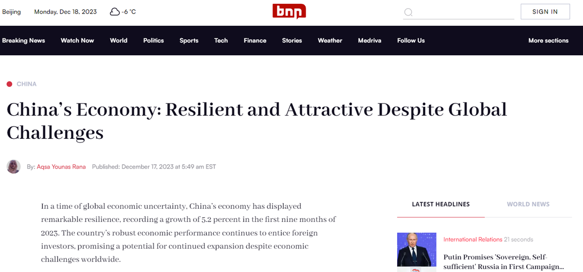 美国新闻网站BNN Breaking报道认为,在全球经济充满不确定性的背景下,中国经济表现出惊人的韧性,2023年前三季增长5.2%。
