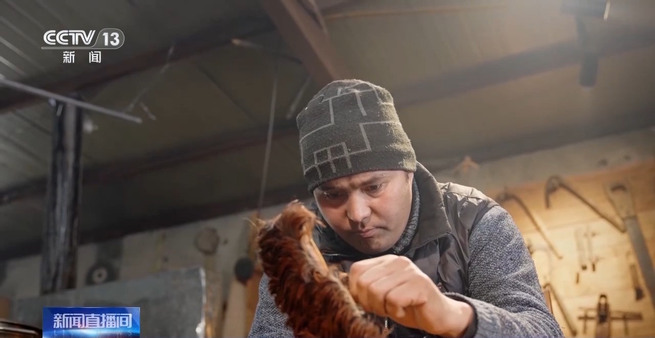 阿勒泰古老毛皮滑雪板制作技艺第三代传承人 斯兰别克·沙合什:现在订单多,我冬天夏天都在做。这些年阿勒泰的冬季旅游红火了。从上海、北京那些大城市来滑雪的人,也好奇来购买。