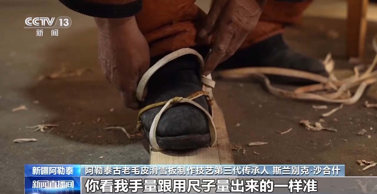 阿勒泰古老毛皮滑雪板制作技艺第三代传承人 斯兰别克·沙合什:这个大小刚刚好,你看我手量跟用尺子量出来的一样准。