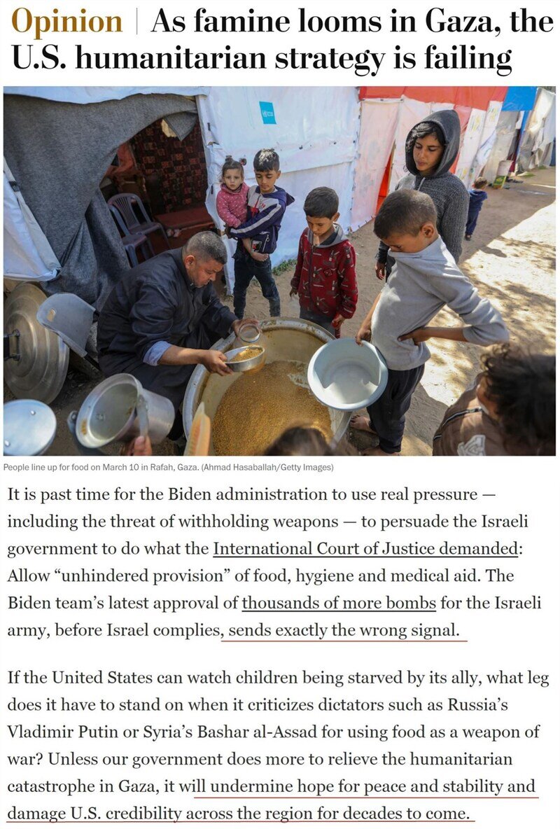 文章认为,拜登政府早就应该利用真正的压力——包括威胁中断武器供应——来迫使以色列政府允许外界向加沙“不受阻碍地提供”食品和医疗援助。但相反,拜登团队最近却批准再向以军提供数千枚炸弹,“这发出了完全错误的信号”。