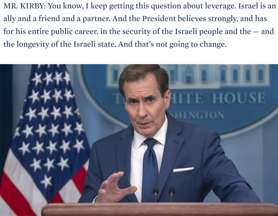 白宫国家安全委员会战略沟通协调员柯比当天在记者会上被反复追问“美国是否会切断对以色列的武器供应”时一味回避躲闪,但在回答美以关系问题时却斩钉截铁。