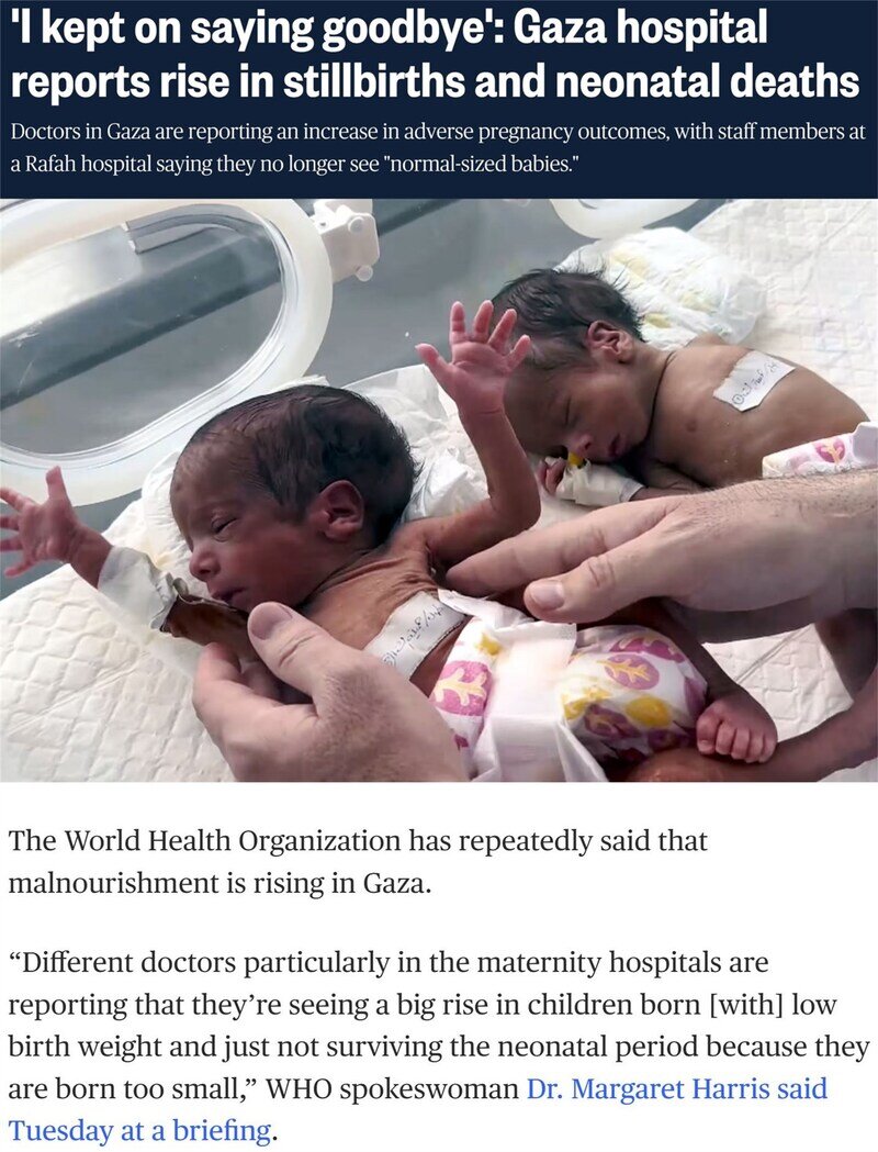 世界卫生组织日前警告,加沙新生儿的死亡率正在直线上升。此外,还有大量婴儿的体重达不到正常标准,导致他们过早夭折。