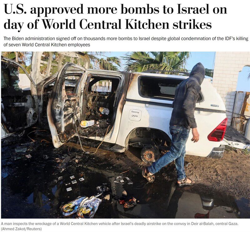 据美媒报道,就在以军袭击国际慈善组织的同一天,美国批准再向以色列提供数千枚炸弹。