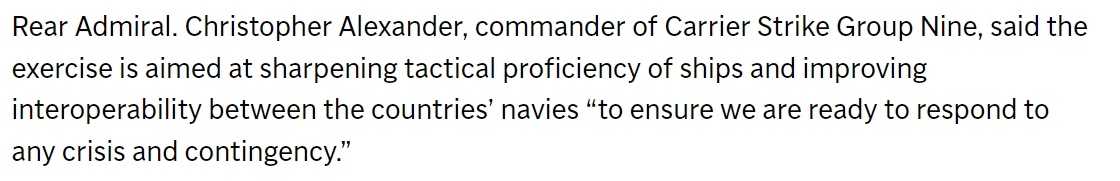 美国第九航母战斗群指挥官克里斯托弗·亚历山大则称,此次“自由之刃”演习旨在提高舰艇的战术熟练程度,增强三国海军之间的互操作性,“以确保我们做好应对任何危机和突发事件的准备”。