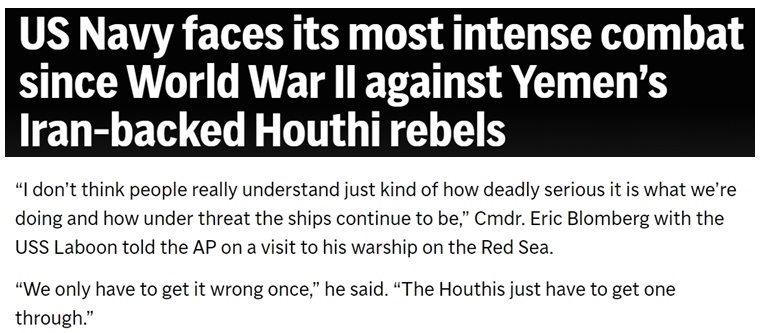 用美国海军中校埃里克·布隆伯格的话说:“人们并不真正理解我们的舰艇受到多么大的威胁……我们错一步就会输掉全局,而胡塞武装则可以一举成功。”