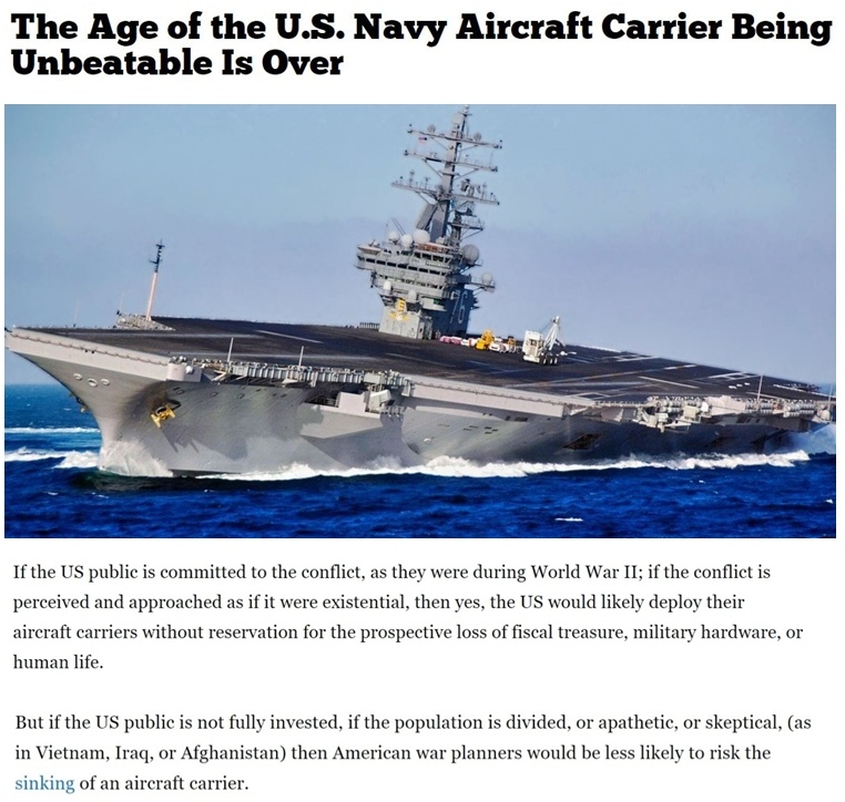 美国《国家利益》杂志则发文直言,美国航母“不可战胜”的时代已经结束。